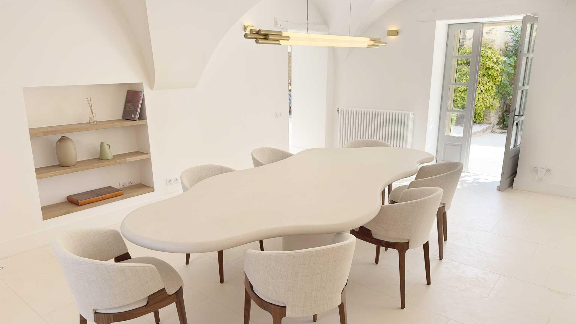 Au cœur de la cour centrale, une grande table, un salon d’été et une cuisine extérieure invitent à de longs repas entre amis ou en famille, à l’ombre des vieilles pierres.