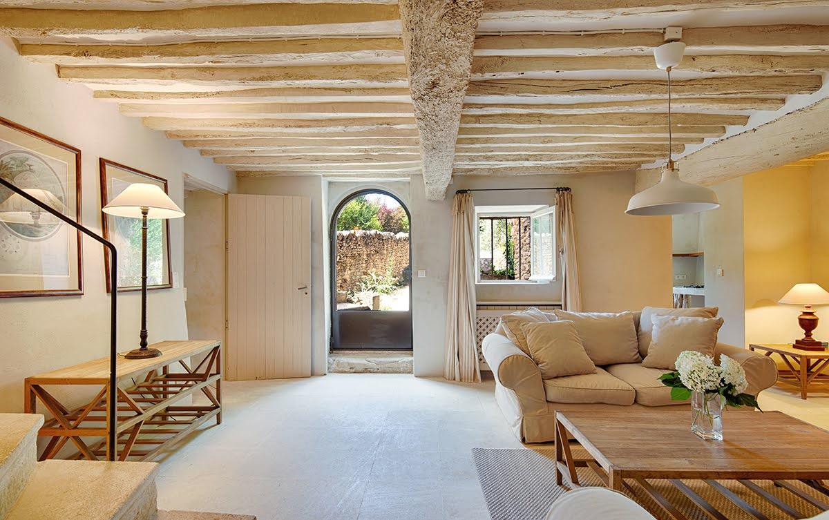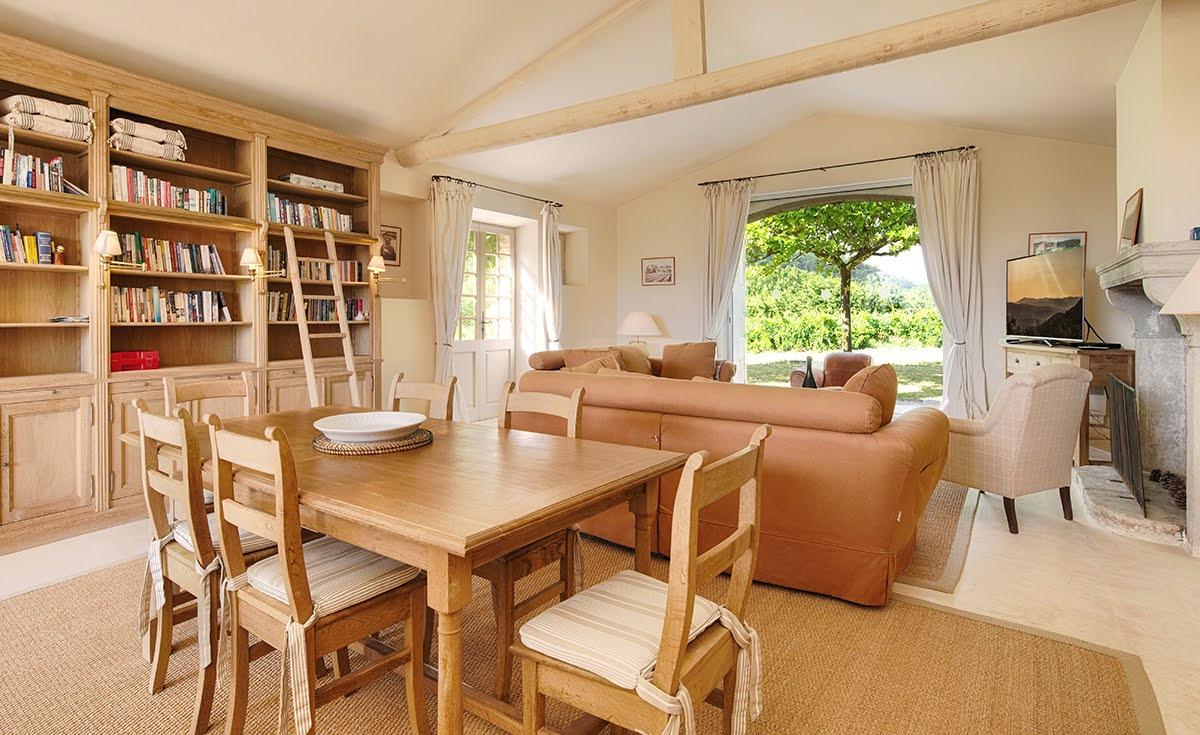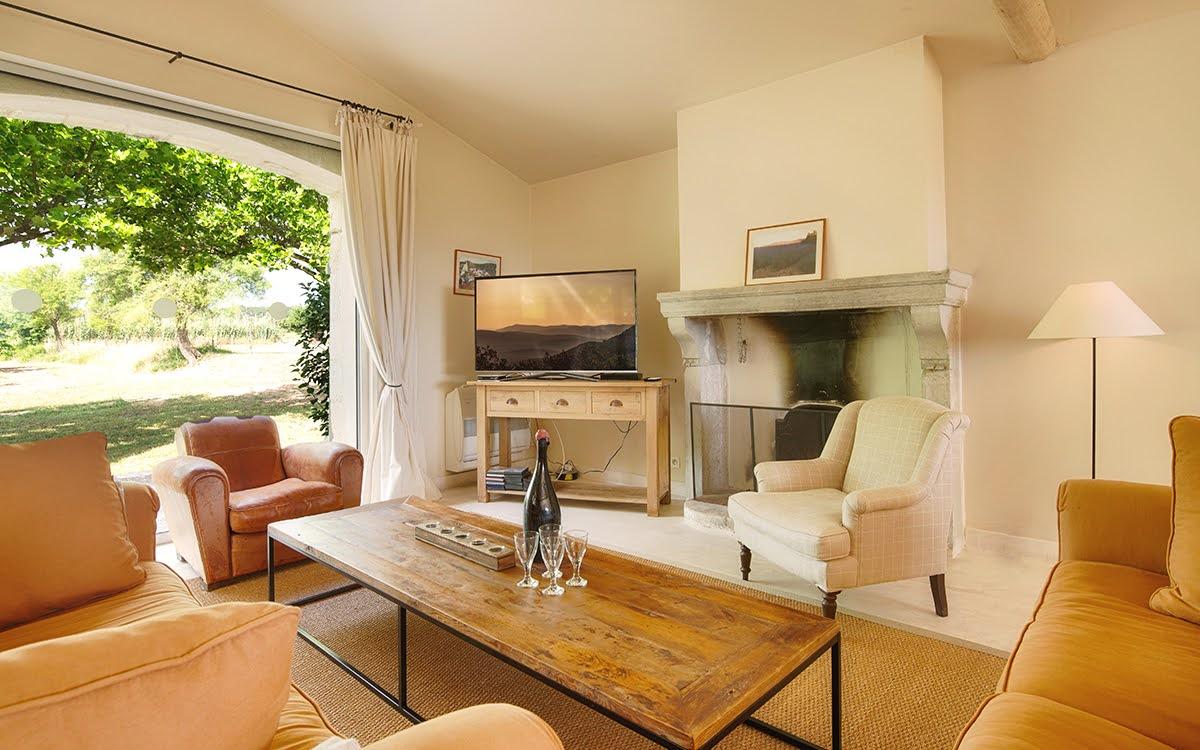 Cette maison de famille est conçue pour accueillir confortablement les grandes réunions. Le salon est spacieux, avec une cheminée et des canapés moelleux. On aime s’y retrouver pour se relaxer à l’abri de la chaleur ou au coin du feu. La pièce s’ouvre sur la terrasse principale à l’ombre de la glycine, où la grande table permet de se réunir à 20 pour partager les repas tous ensemble.