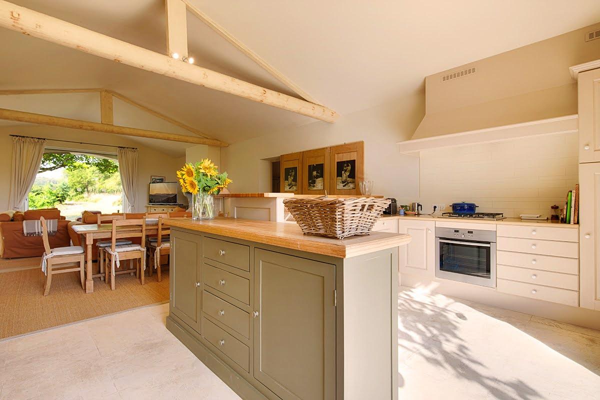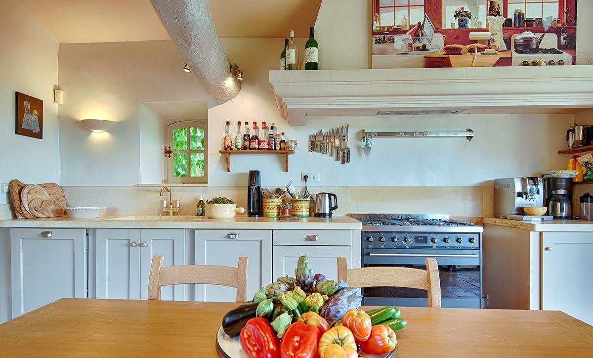 La cuisine est à la mesure des lieux : spectaculaire avec sa grande verrière et sa petite terrasse panoramique (d’où l’on aperçoit parfois les montgolfières se poser dans le champ voisin : magique !). Elle est entièrement équipée et idéale pour cuisiner en grandes quantités. Les amoureux des fourneaux seront comblés, autant par l’équipement que par la collection de livres de cuisine réunie par les propriétaires. Quelques marches descendent du balcon vers la terrasse principale.