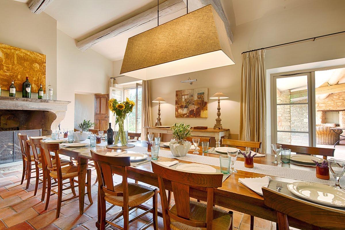 La salle à manger est une jolie solution de repli en cas de pluie et un repaire cosy hors saison chaude : la cheminée permet de dîner au coin du feu. Elle s’ouvre sur une autre terrasse avec vue imprenable sur la campagne alentour. Parfaite pour prendre le petit-déjeuner dans le salon extérieur, cette terrasse communique avec la chambre parentale.