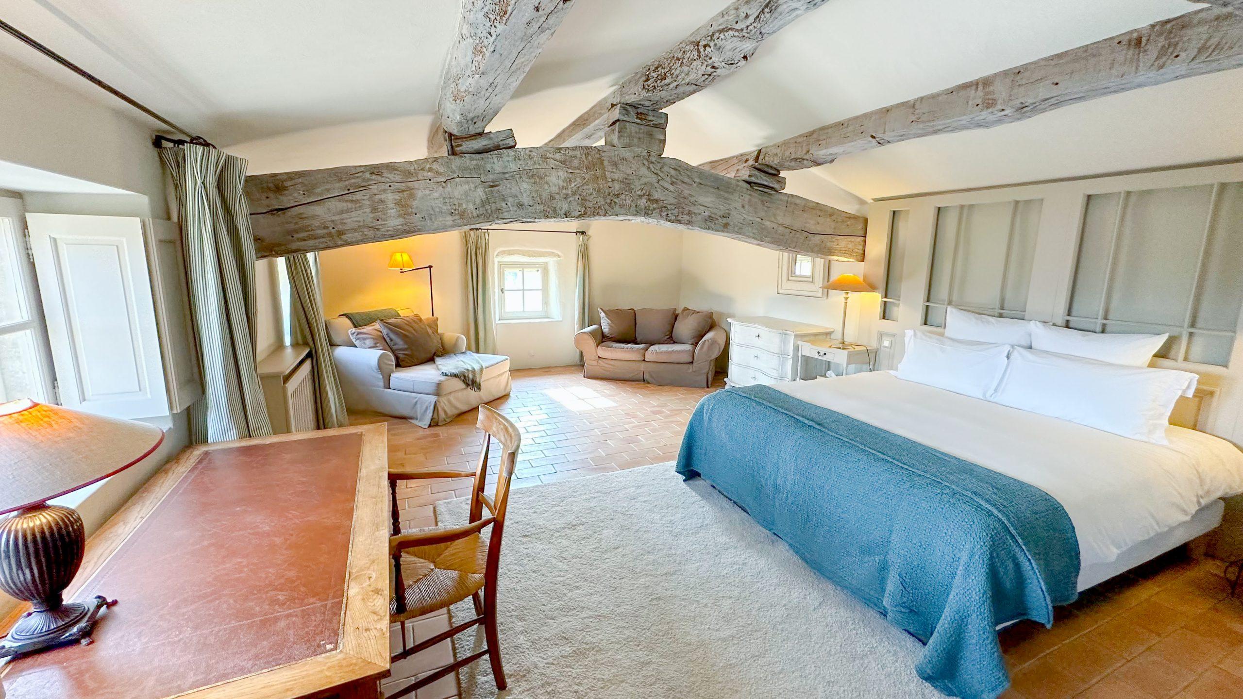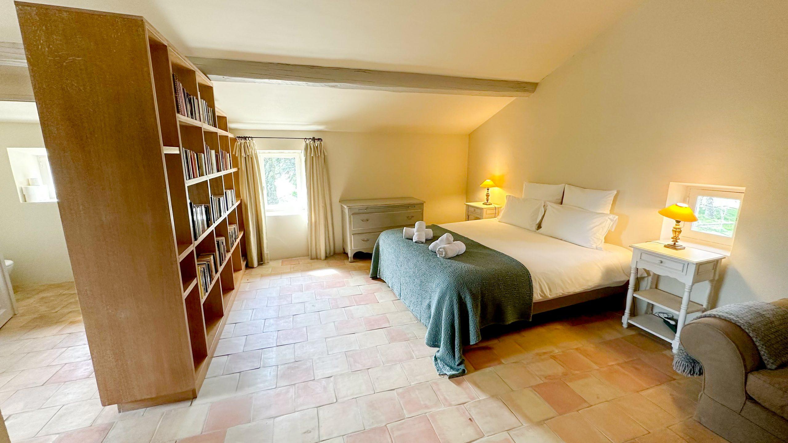 La chambre parentale est une grande pièce très agréable avec un lit king size de 180 x 200, et s’ouvre sur une terrasse avec vue sur la vallée (laquelle terrasse communique aussi avec la salle à manger). Sa salle de bain est située de l’autre côté du couloir avec baignoire, douche à l’italienne et WC.
