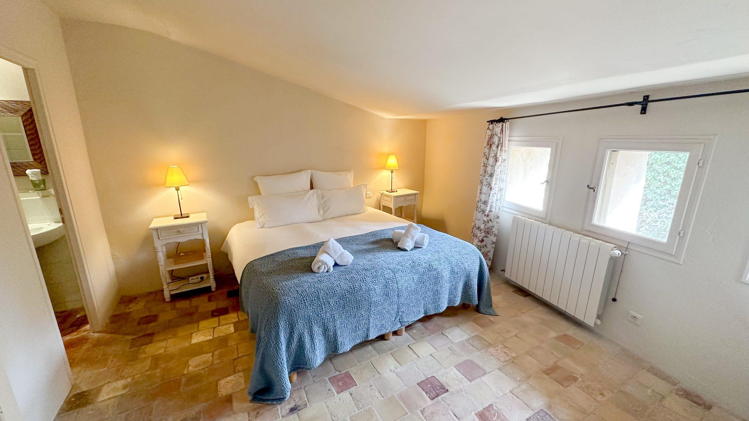 La chambre 1 s’ouvre sur la terrasse côté est, avec vue sur la vallée. Elle comprend un lit de 160 x 200, une commode et une penderie, une SDB attenante et un WC séparé.