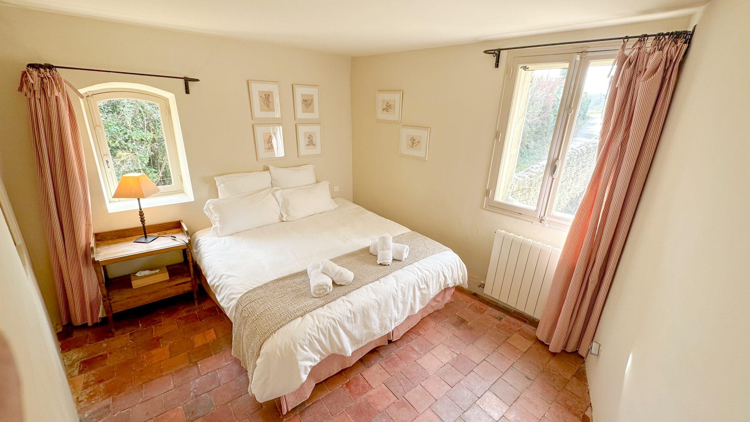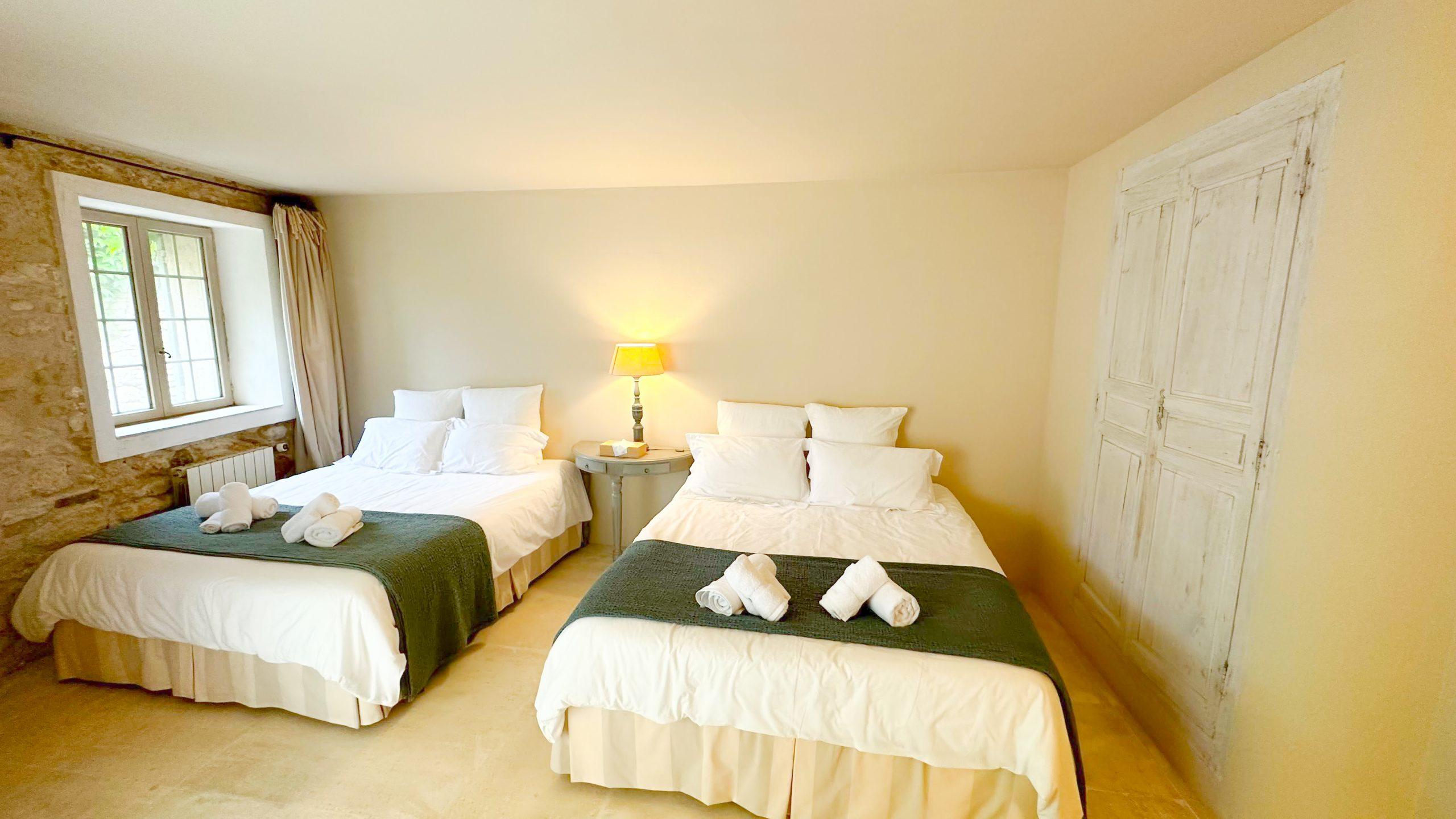 La chambre 3 a deux lits simples. Les fenêtres en forme de hublot offrent un point de vue spectaculaire sur le village perché de Gordes. On adore l’esprit alcôve de cette pièce. La possibilité d’apercevoir par la fenêtre les chevaux du pré voisin réjouit petits et grands.