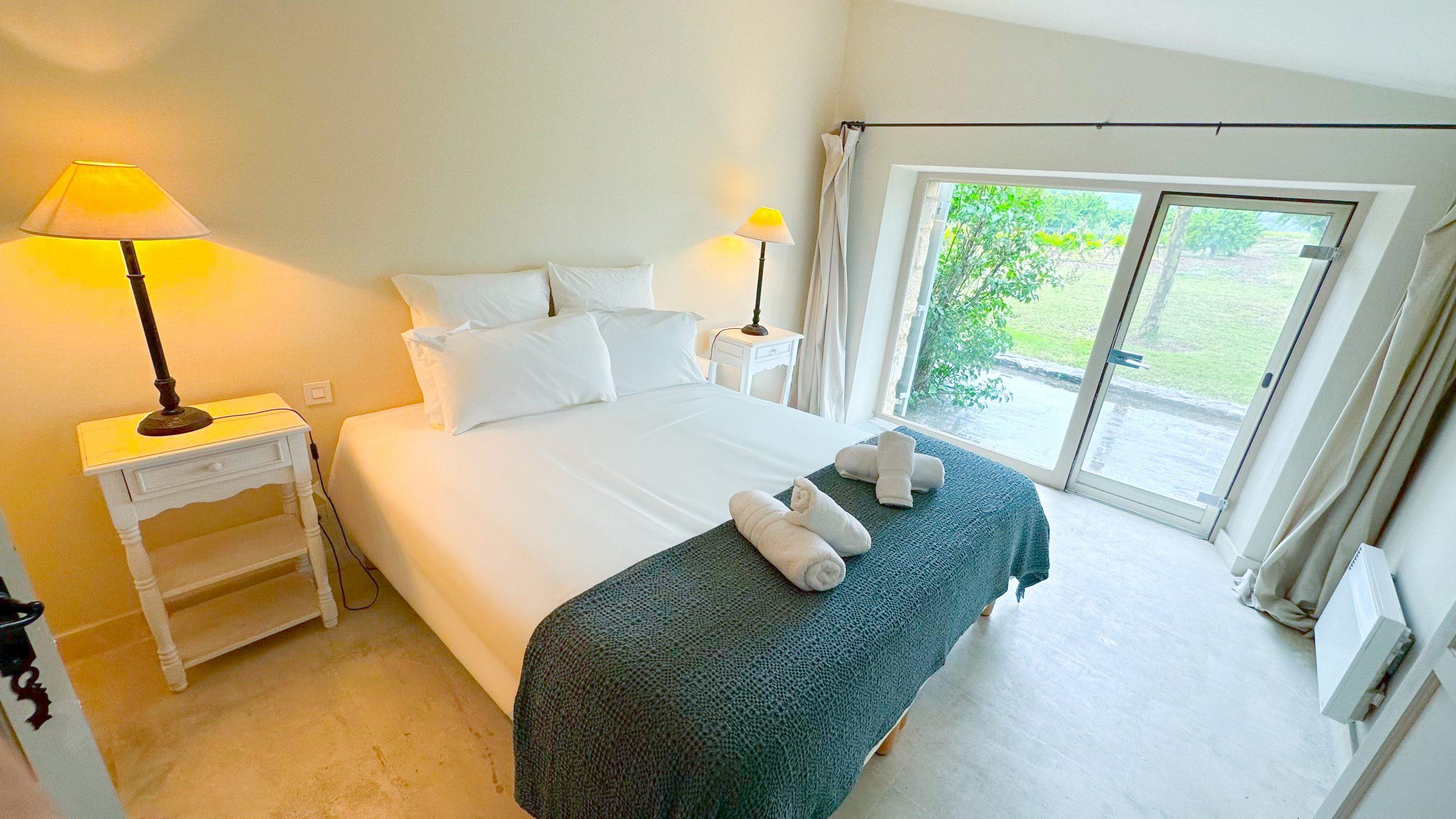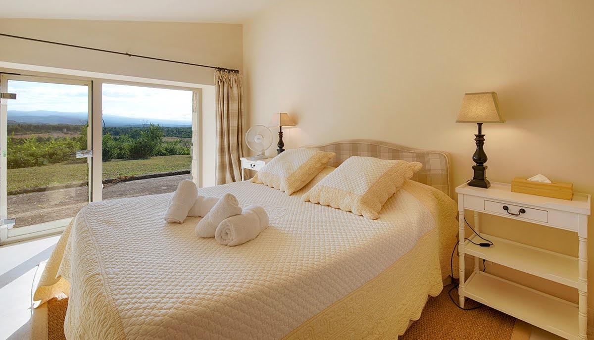 La chambre 2 donne sur les vignes côté ouest. Elle comprend aussi un lit de 160 x 200, une commode et une penderie, une SDB attenante et un WC séparé.