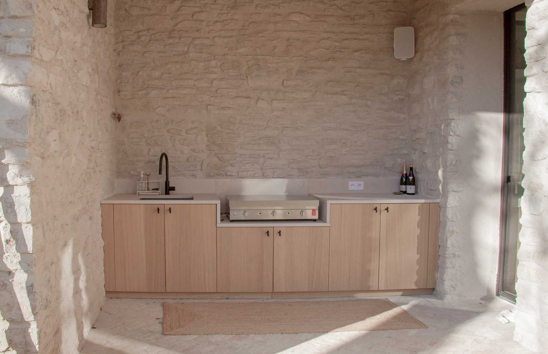 – Une cuisine ouverte entièrement équipée, avec accès à la cuisine d’été