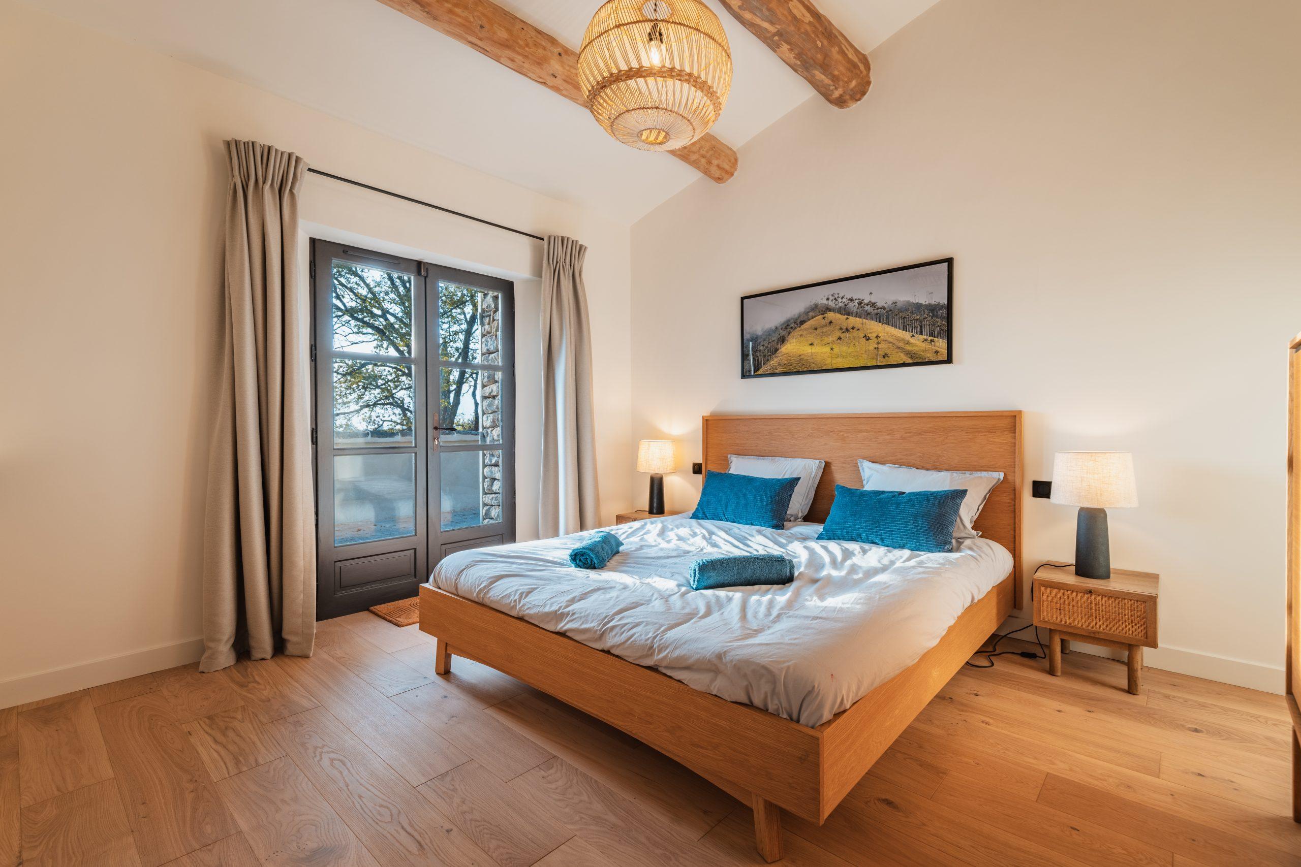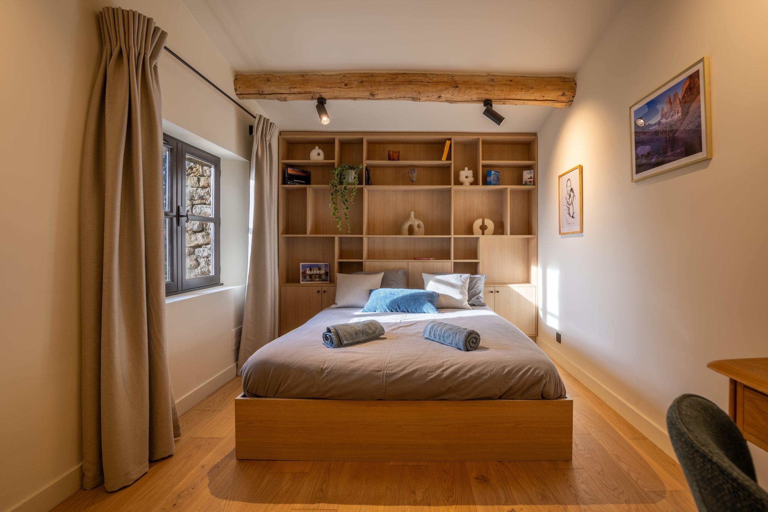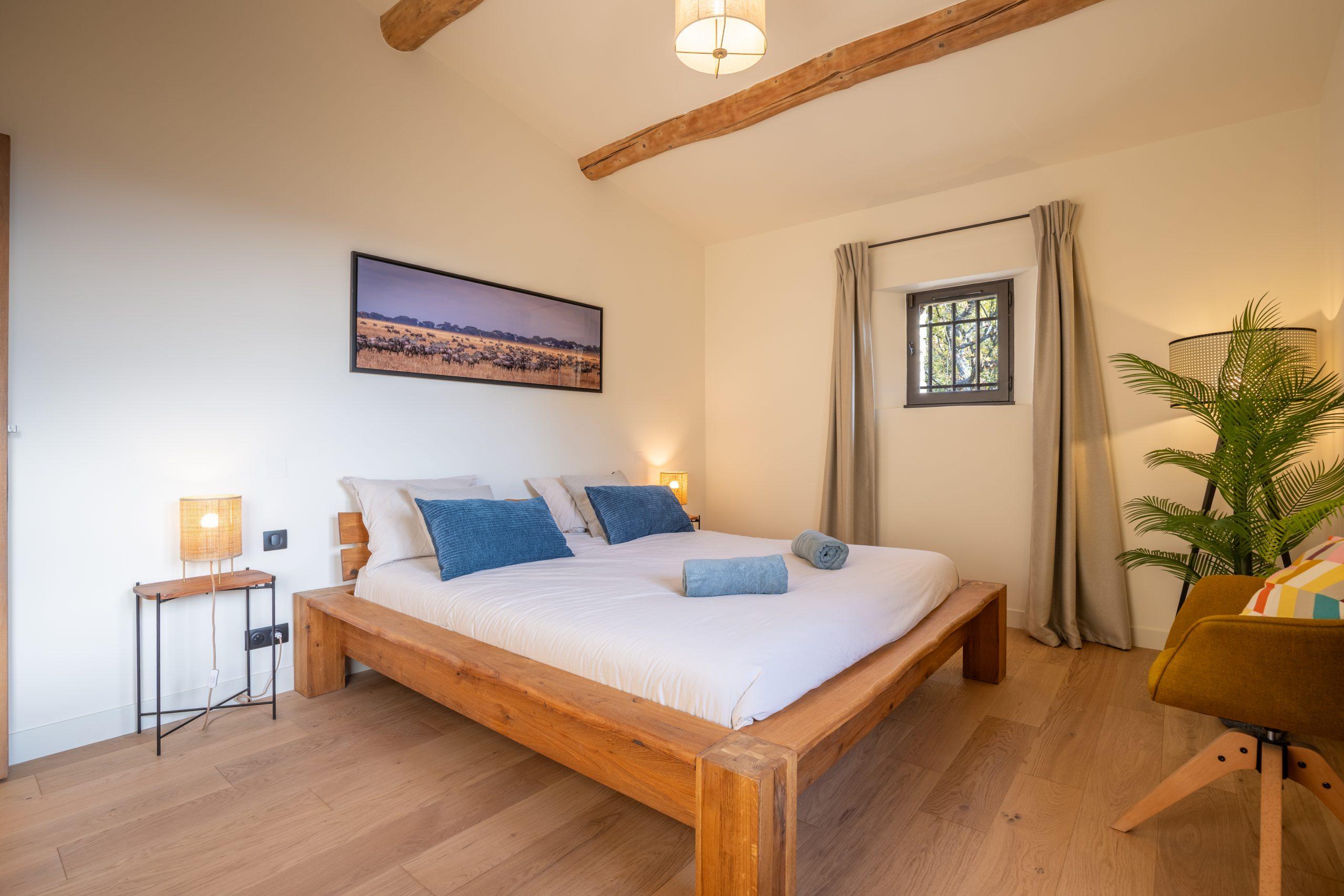 Dans le bâtiment principal, les 4 chambres sont équipées d’un lit d’hôtellerie super king-size (2x2m) avec du linge de lit haut de gamme.
